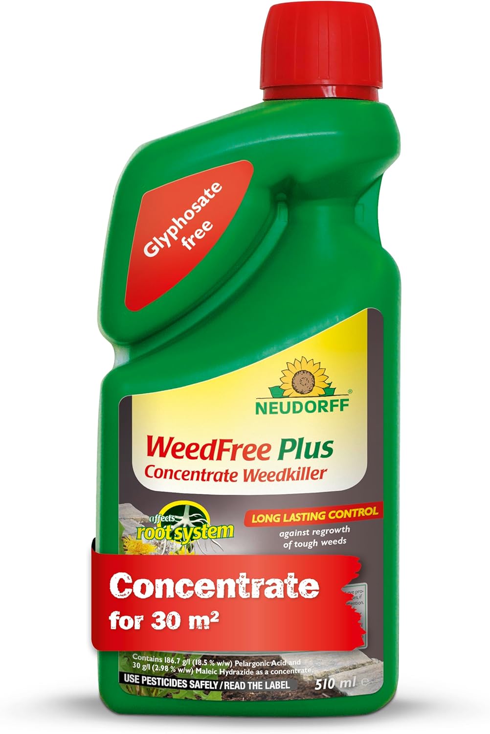 Neudorff WeedFree Plus Concentrate. Powerful weed control. Take control of your garden with Neudorff WeedFree Plus Concentrate, a glyphosate-free weed killer that kills tough weeds and prevents regrowth. For patios, driveways and garden paths, this concentrate provides long-lasting weed control to keep your outdoor spaces pristine. Powerful active ingredients. Formulated with 186.7g/l pelargonic acid and 30g/l maleic hydrazide, WeedFree Plus destroys weed cell walls and inhibits root growth for thorough and lasting weed control. This dual-action formula provides complete control, making it a choice for every gardener. Easy to mix and use. For best results, mix 85ml of WeedFree Plus with 500ml of water to treat 5m². Soak weeds thoroughly to ensure maximum uptake. A 1 litre bottle covers up to 60m², providing an solution for large areas. Eco-friendly and safe. Neudorff’s WeedFree Plus is a glyphosate-free weed killer that is safe for use around pets and wildlife when dry. Its biodegradable formula supports organic gardening practices and promotes a healthier approach to weed control. Convenient dosing bottle. The 1020ml dosage bottle simplifies mixing and ensures precise, mess-free application. This convenient packaging makes application easy, saving you time and effort in your gardening tasks. Application tips for best results. Mix 85ml with 500ml of water per 5m². Thoroughly soak weeds for optimum absorption. Apply on a dry day to avoid dilution by rain. Avoid windy conditions to minimise drift. Transform your garden with Neudorff WeedFree Plus Concentrate, your reliable partner for effective weed control. Take a greener approach to maintaining your outdoor spaces while achieving weed control.