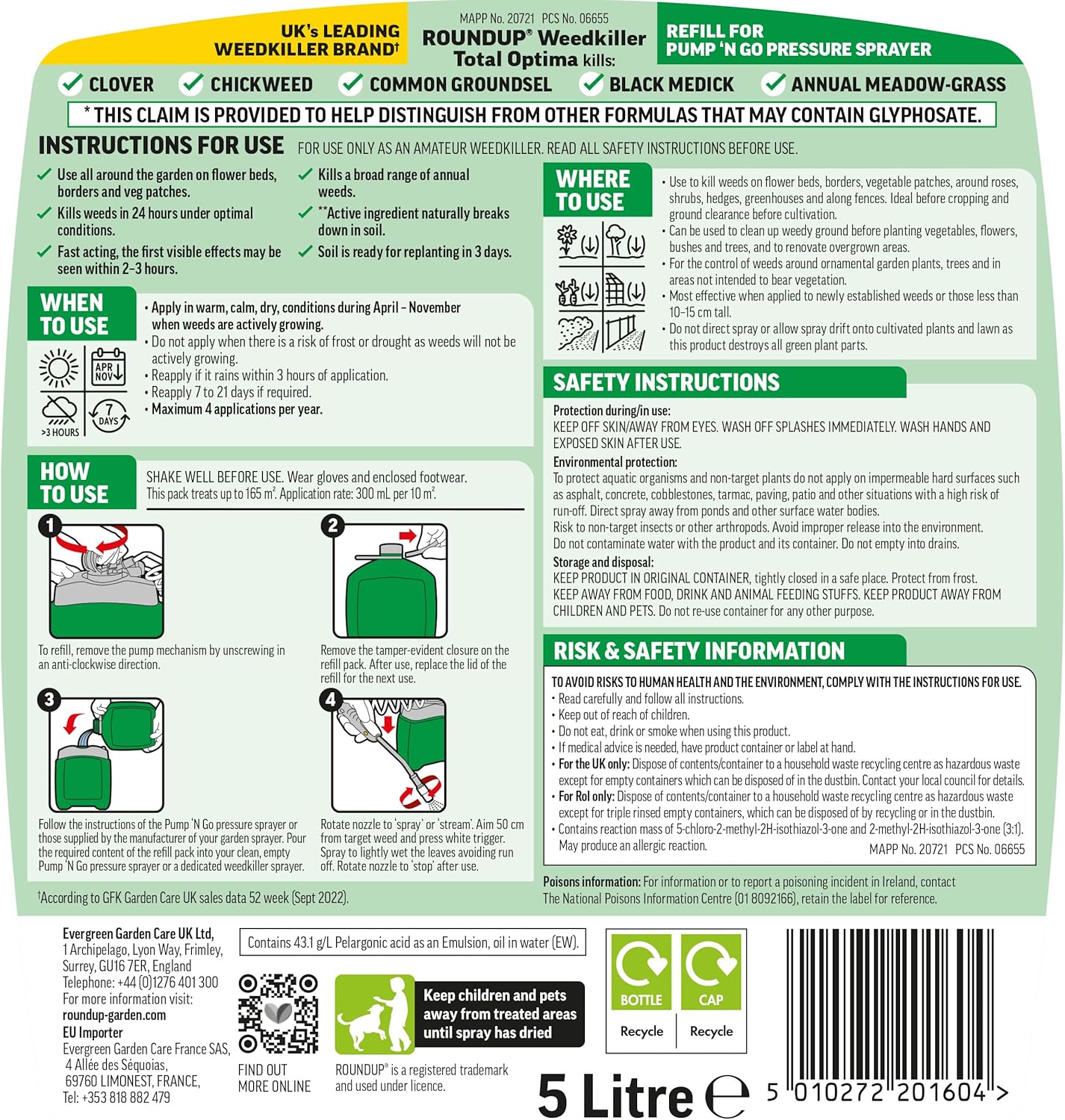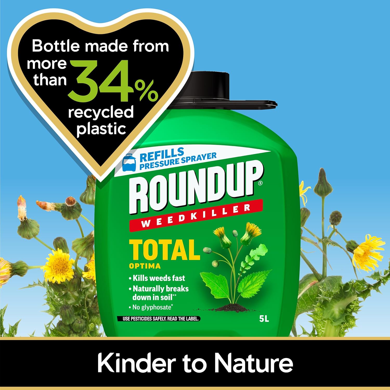 ROUNDUP Weedkiller Total Optima can be used on weeds in flowerbeds, borders, pots, containers and vegetable patches as well as paths and patios. It’s most effective on young weeds smaller than 10 cm.